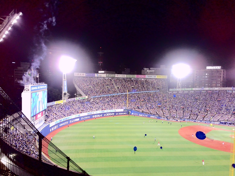 ベイスの七回の攻撃です。スコアボードから煙が出ているのはついに頭がバクハツした、のではなく、花火の後です。浮かんでいるぶつぶつは青い風船(彼らの用語では「ジェットスター」とかいうみたいです)です。「3万2千人、満員御礼です」といってましたが、「完売御礼」です。フェイクはいけません。