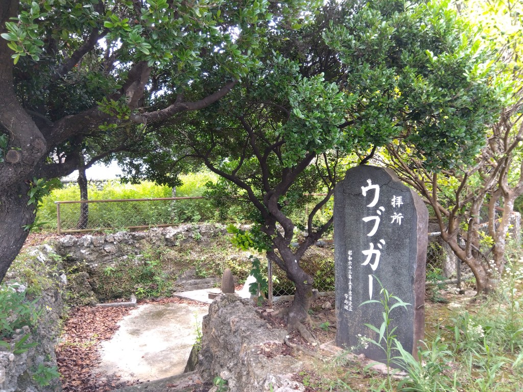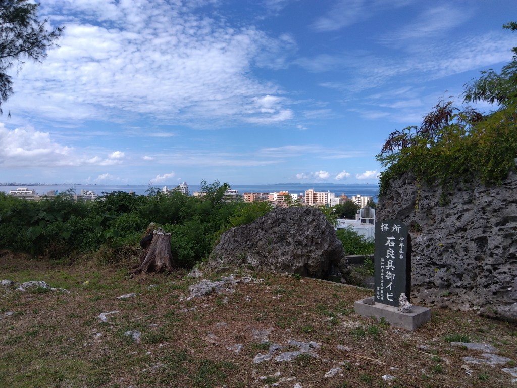 〇伊平屋森石良具のおイビ ・・・ 国道58号線や嘉手納飛行場のある台地の端になります。眼下に砂辺の村が見え、村の「腰当て」山となっていたことがわかります。おそらく昔むかしは、祭礼の日に、海の向こう(おそらく伊平屋)から来た祖神(うやがん=おやがみ)が、ここから村に降りて来る聖地だったのでしょう。なお、イビは奄美で「イベ」、本土で「齋辺(いみべ)」、神域の至聖地を指すことばです。