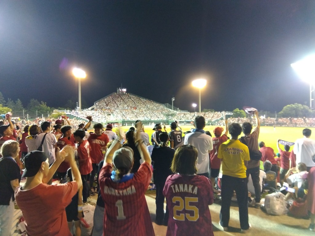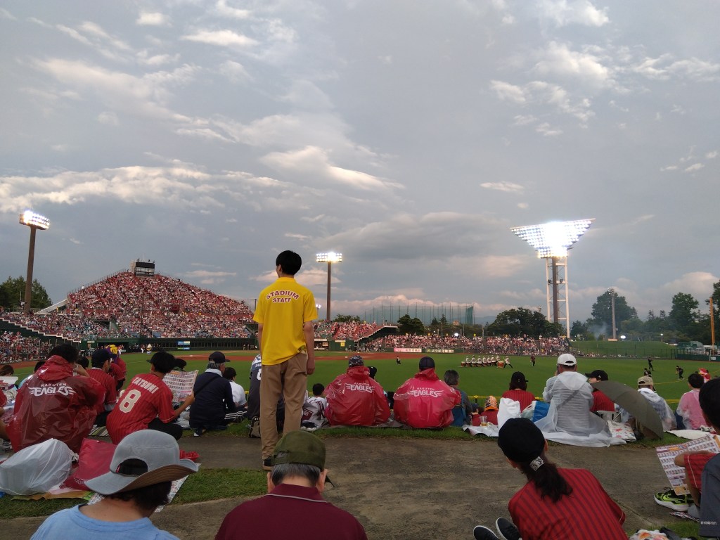 なかなか前が見えないんですわー。楽天ファンは攻撃時スタンディングなので一段と見えません。まあでも何とかなります。それにしてもネット裏のピラミッドみたいな構造はどうなっているのでしょうか。上の方の席は年寄にはツラいのでは。