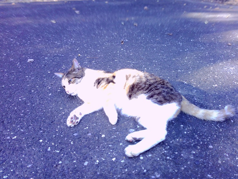 今日の収穫はこの「手前ミケ」。いつも警戒していた(もちろん向こうが)が、今日は他のエサやりさんの紹介(ほんとですよ)でしりたたきしたらごろんごろん転がり始めて仲良しに。