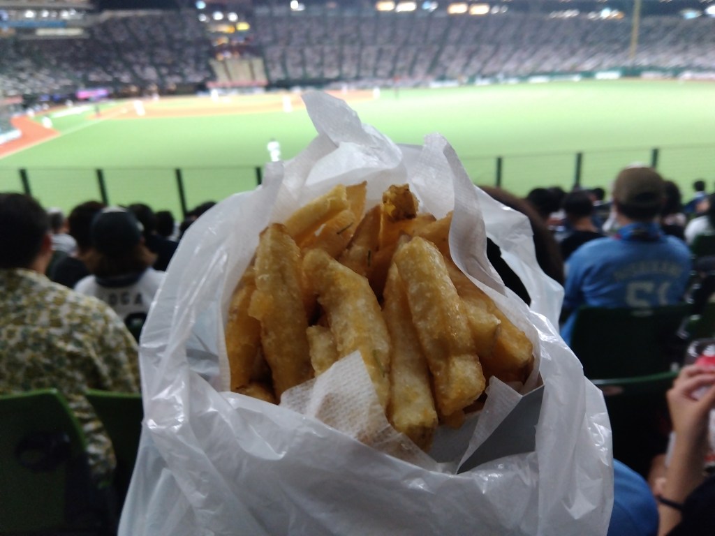 今日は涼しいのに水撒きしてました。一番安いポール際席へ。このポテトほんとにうまい。塩きついし。試合終了です。