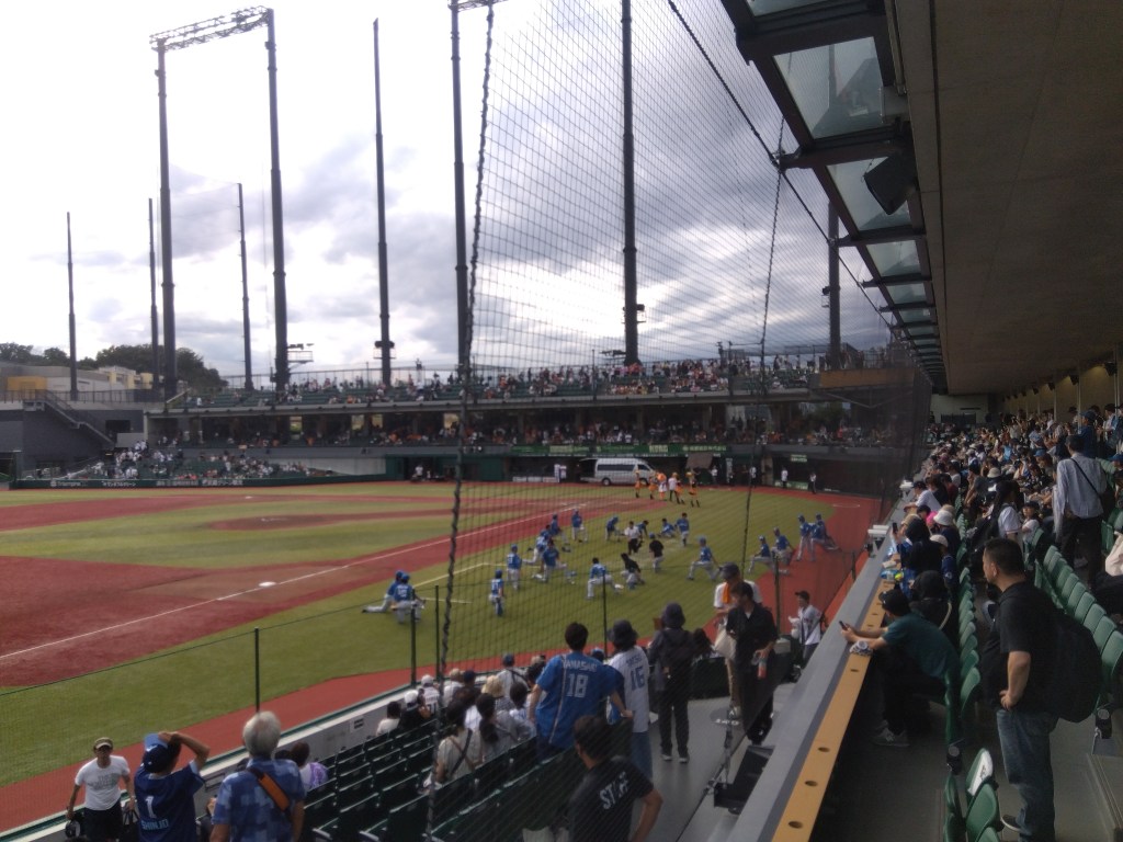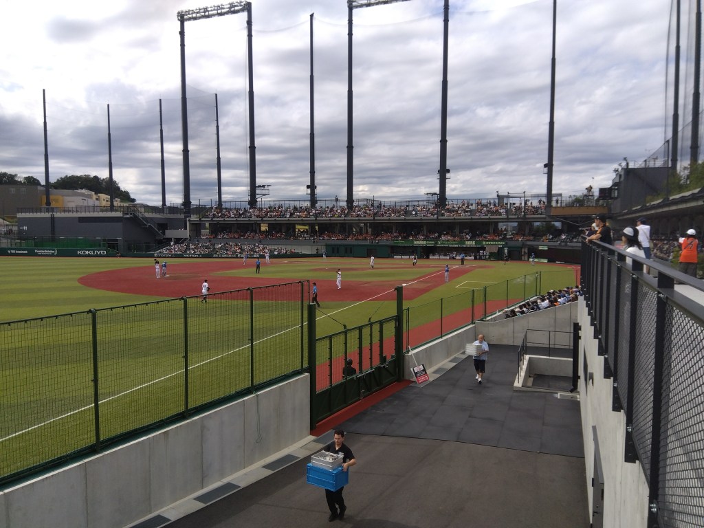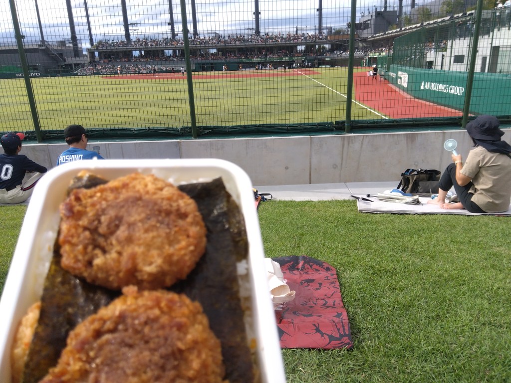 コンコースを経て芝生席500円へ。よく整備された自然芝でほんと素晴らしいのですが、アリは多い。5回終了時に弁当食べた。昨日と同じシイタケはさみフライが載っていますが、これは買い置きではなく、昨日は一昨日のが残ってさらに半額だったので買いました。1個あたり30円台。賞味期限は昨日の夜なんだと思います。そんなの見て買わないから知らんけど。一番左は試合終了。ハムのヤツらが説教されている。