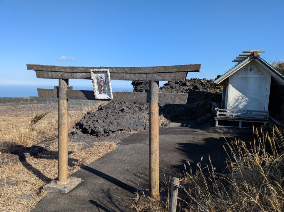 29日なんとか登った三原山の三原神社。溶岩流流れてもこの神社だけは避けるという。