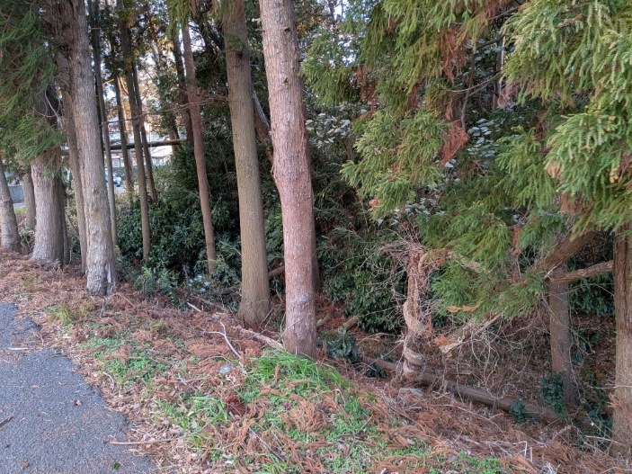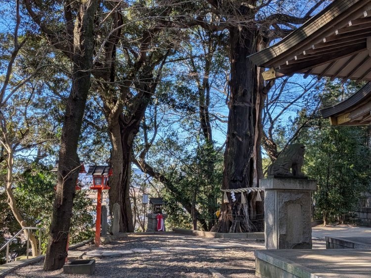 右側の太いのが室町時代から生えている神木の楠です。昭和何年かの大火で半分焼けたけど生きているようです。その向こうは急な崖になって、空堀の役割を果たしています。