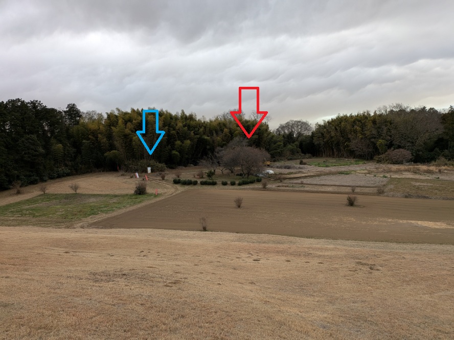 船塚山古墳前方部から見下ろしてみます。赤矢印が17号墳。船塚山の陪塚と考えられ、鉄製鎧などが発掘されました。青矢印は18号墳。
