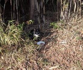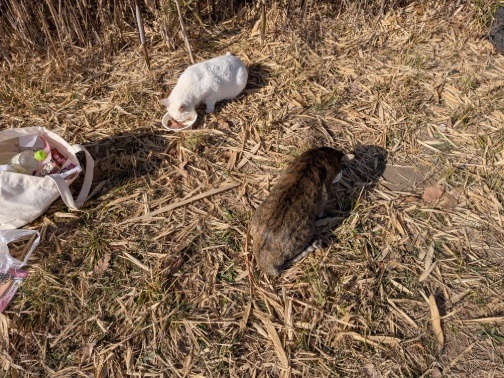 久しぶりでタキシード猫が出てきました。こいつはニャアニャア鳴いてエサを要求してきますが、たいへん臆病なのでエサを見て逃げたりします。今日は食いました。