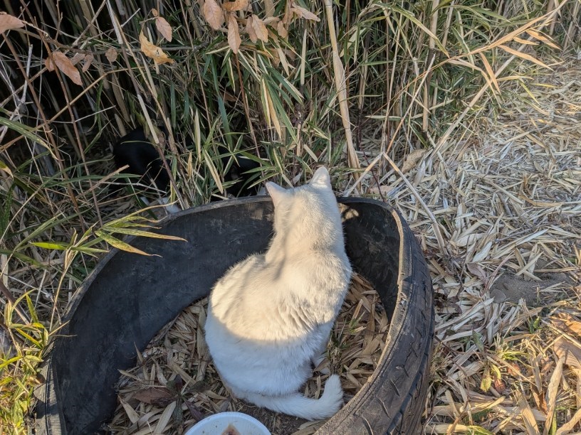 キティミケには会えず、ひきあげようとしてシロネコたちを見に来たら、タイヤネコになってました。タイヤを占拠し、左上のタキシードを見下しているのがおもしろいですね。