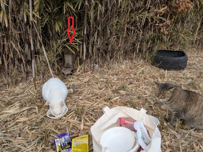 埼玉県戸田の駐車場近くのネコにゃぞ。飯を食うシロネコ、右早くエサ寄こせ状態のシマネコ、矢印は伝染病タヌキ。