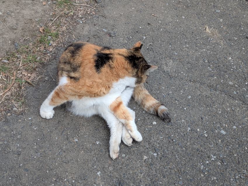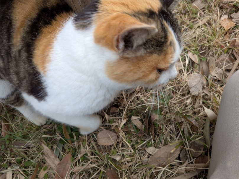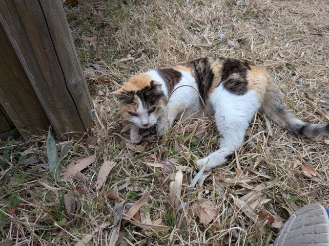奥ミケだ。目が見えなくなってからカラスなどを恐れてかあまり鳴かなくなっていたんですが、今日はよくぎゃあぎゃあと鳴きました。地面が暖かくなって大胆になっているのでしょう。