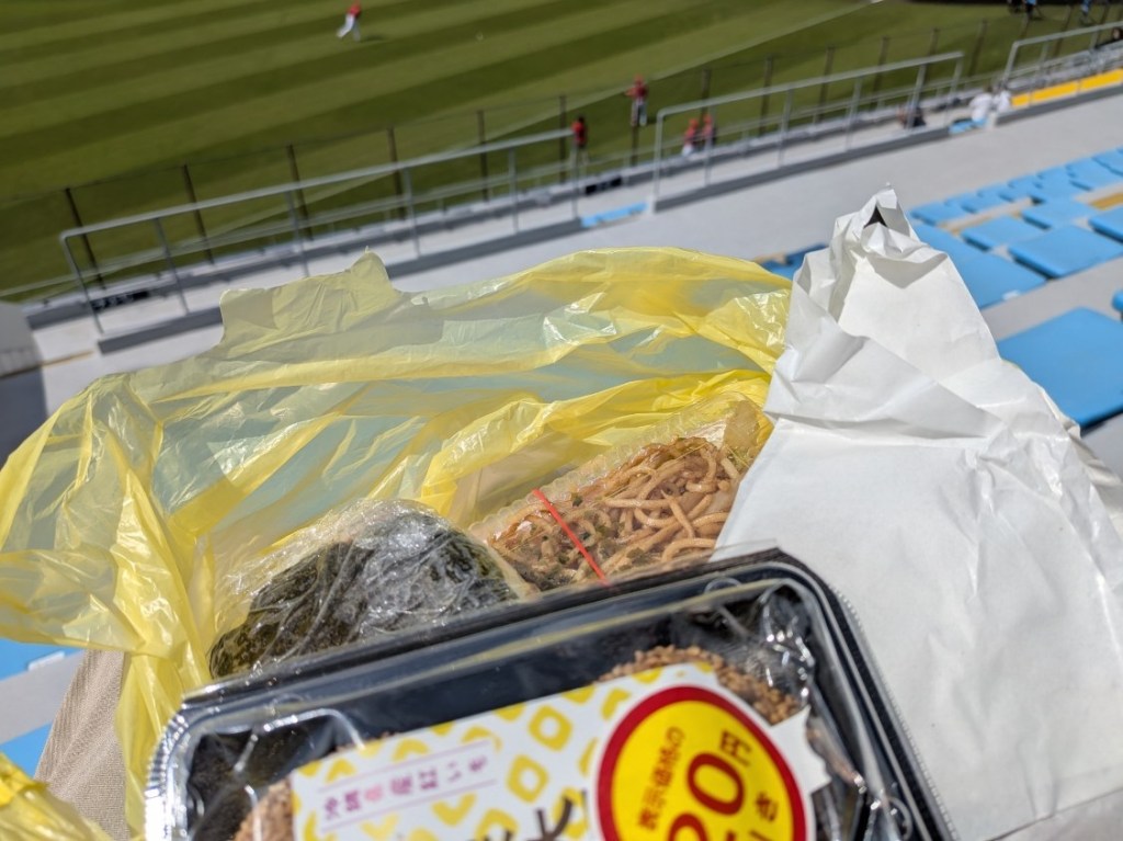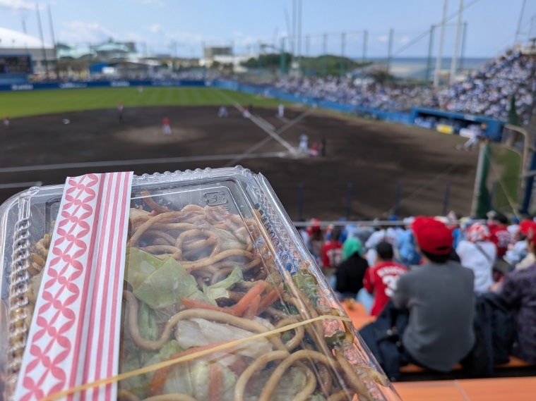 やきそばです。もちろんこれは代表例として出しただけで、スパムおにぎりやらサラダやらも持っています。