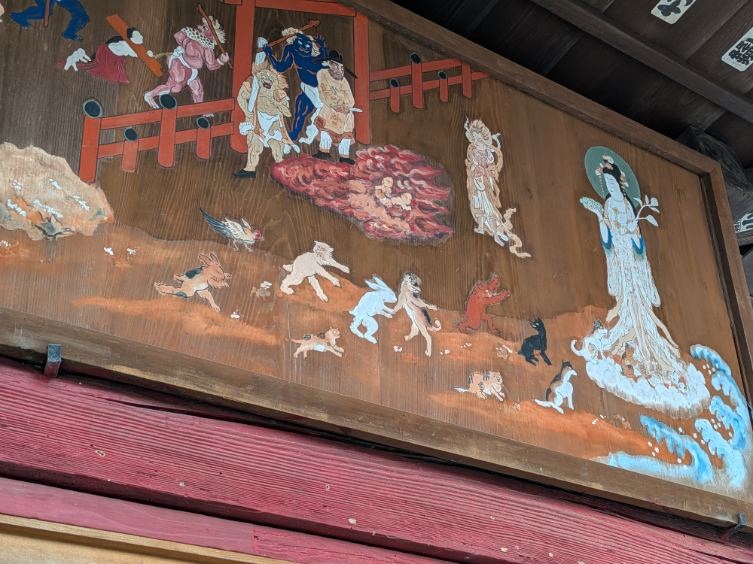 今日はこれがありがたかったなあ。閻魔堂の絵馬です。観音様がイヌ・ネコ・ウサギなども救いに来てくれてます。〇〇人に食われたミケも、もう救われているに違いない。いろいろありがとうニャ。