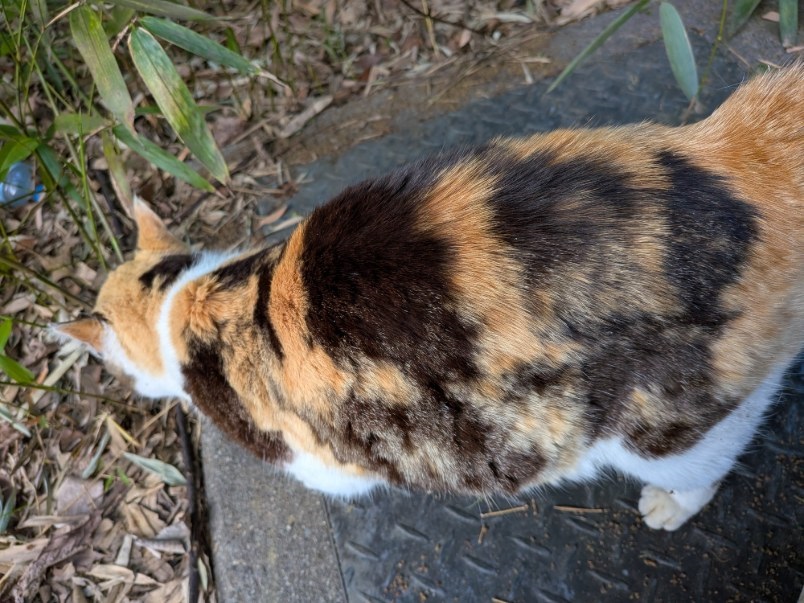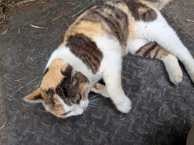 公衆便所の蓋の上でごろごろしているシュレミケだ。今週も会えました。この蓋の上は屎尿の発酵をさせているので暖かいんです。先週よりは少し元気かなあ。毎日えさやりしているおねえさん(世間的にはおばあさん)が「少し太ったでしょ」と言ってましたが、如何か。