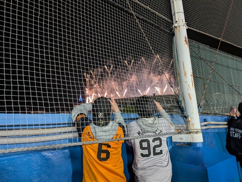 国立競技場のイベントにより花火があり、二回中断。うれしそうな右マルティネス、左坂本だ。坂本は今日代打で四球選んでいたが、マルティネスはこんなところにおってはいかん。
